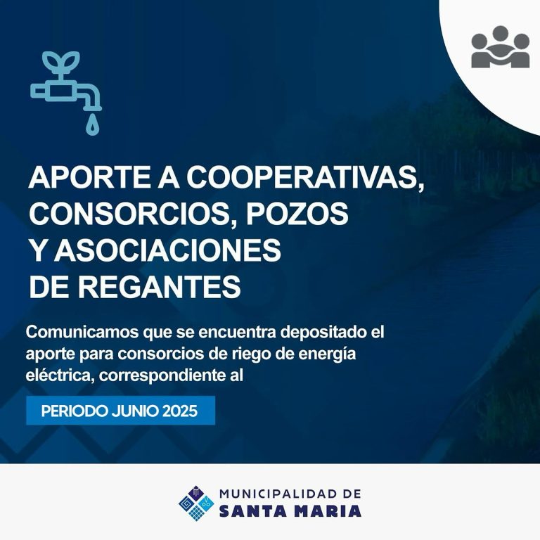 Informamos que ya está depositado el aporte para los consorcios de riego de energía eléctrica, correspondiente al mes de junio 2025.